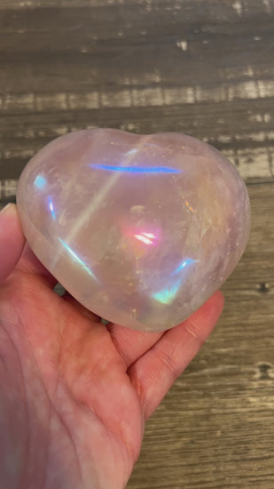 Aura Rose Quartz is natural Rose Quartz that has been bonded with Platinum which produces an opalescent sheen. Aura Rose Quartz stimulates the Heart Chakra and attracts positive and loving energy to you. It calms nerves and helps you communicate and act with grace. Aura Rose Quartz inspires self-love as well as love for others. It can enhance your compassion and nourish your aura.