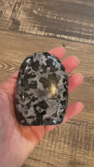 Mystic Merlinite (Indigo Gabbro) is known as a stone of transformation and manifestation. Mystic Merlinite brings balance and harmony to you. It helps to counteract the effects of an excess in either Yin or Yang energy; and is excellent for blending spiritual with earthly energies and can be used to ground temperaments or to bring a sense of safety and security to anyone who is anxious or fearful. It is a powerful energy cleanser and can bring to the fore any past traumas or shocks that may be impacting your present situation. It then gently disperses any blocked or stagnant energy from the auric field and provides support as you do the psychological work needed to free yourself from the effects of past experiences, instances of abuse, or negative patterns and behaviors.